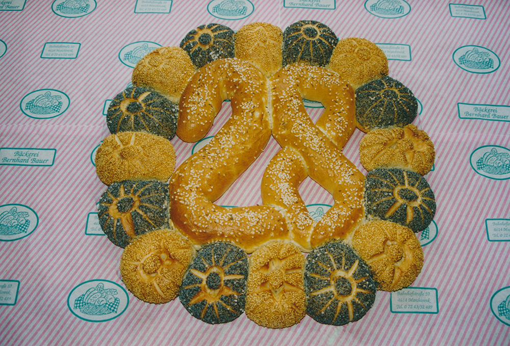 Von links nach rechts: …-Brot, Hausbrot, Marchtrenkerbrot, Käseweckerl, Salzstangerl, …-weckerl, …-weckerl, -weckerl, -weckerl, Laugenkäsestangerl, Mohnschnecke, Kipferl